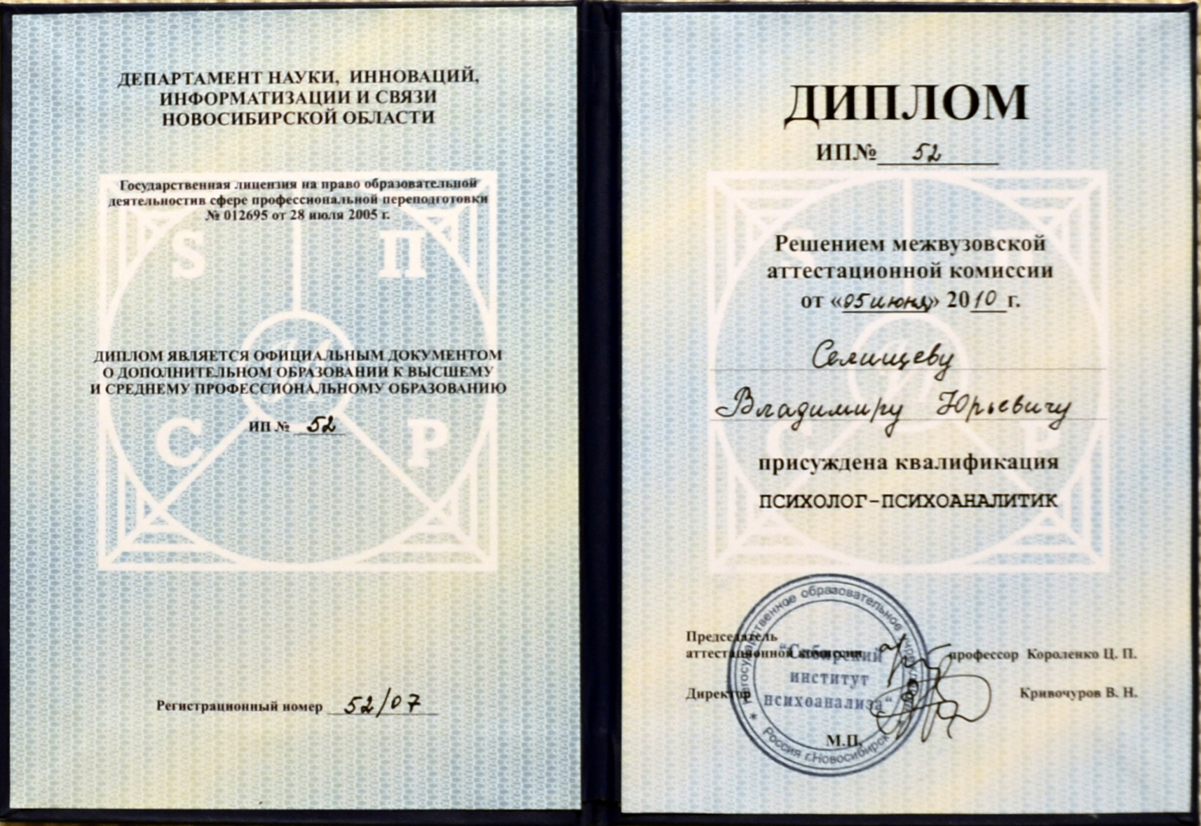 - Повышение квалификации - Восточно - Европейский институт психоанализа (г. Санкт-Петербург). «Психоанализ Фрейда-Лакана. Дистанционная специализация».