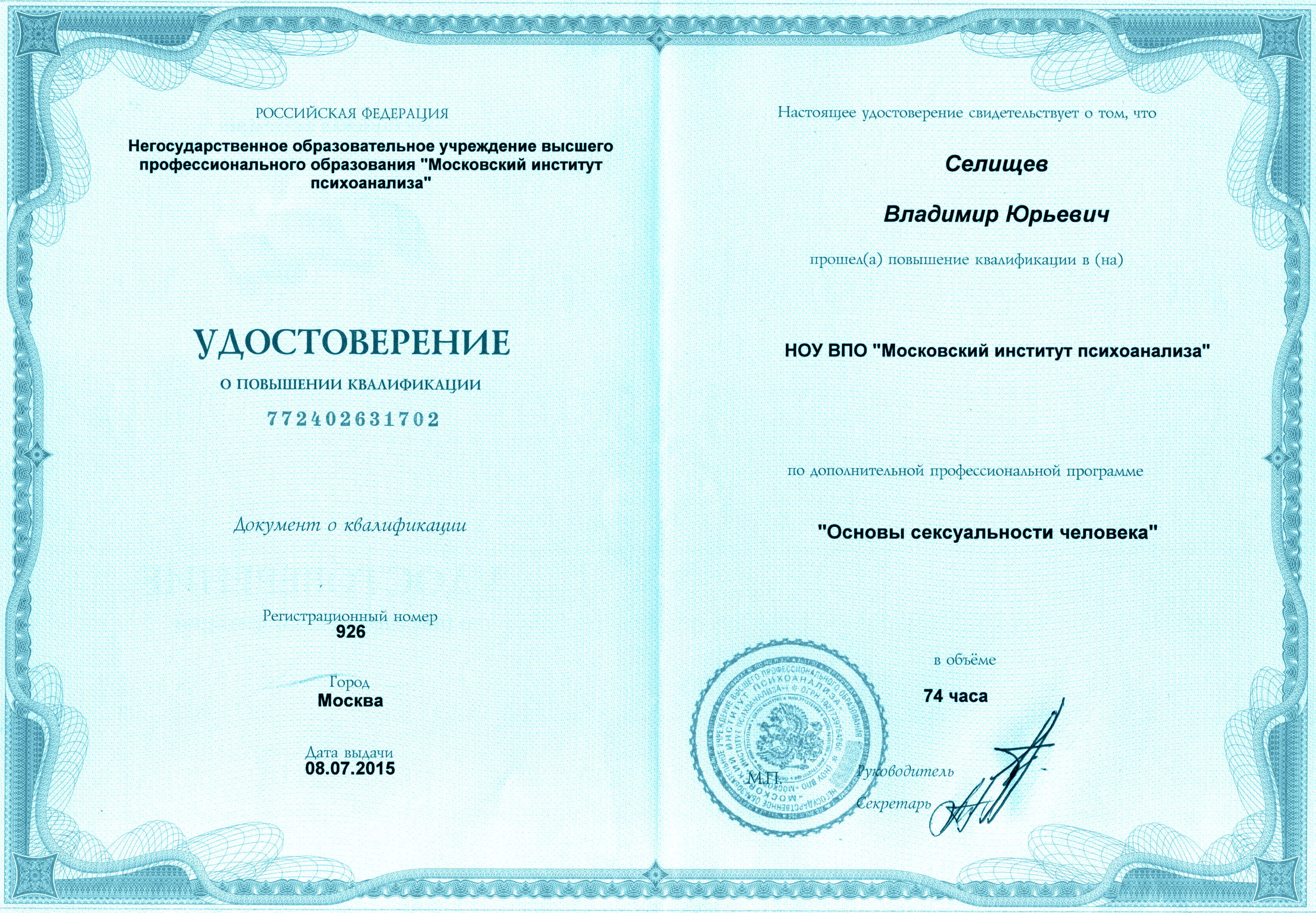 - Повышение квалификации - НОУ ВПО «Московский институт психоанализа» (г. Москва). «Основы сексуальности человека».