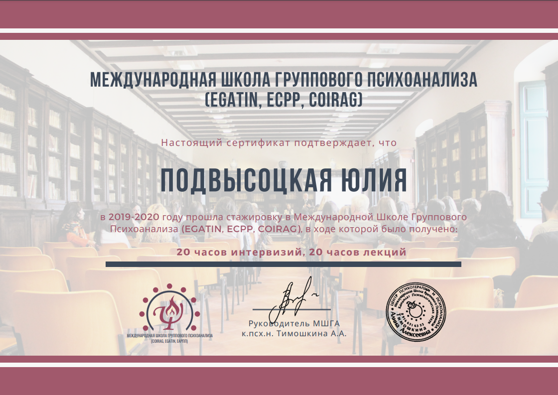 Стажировка в Международной Школе Группового Психоанализа (EGATIN, ECPP, COIRAG).