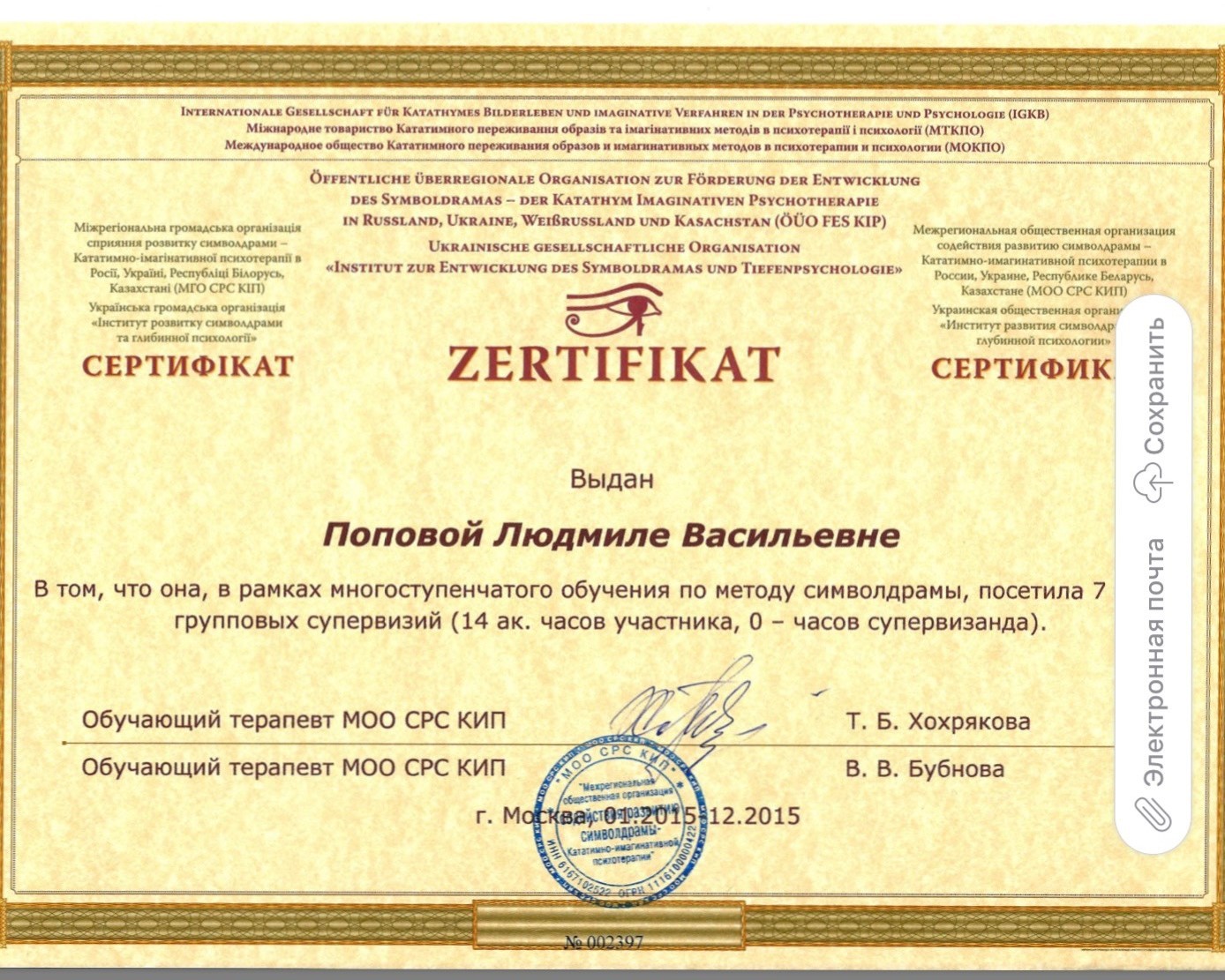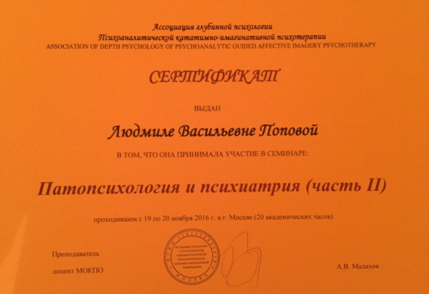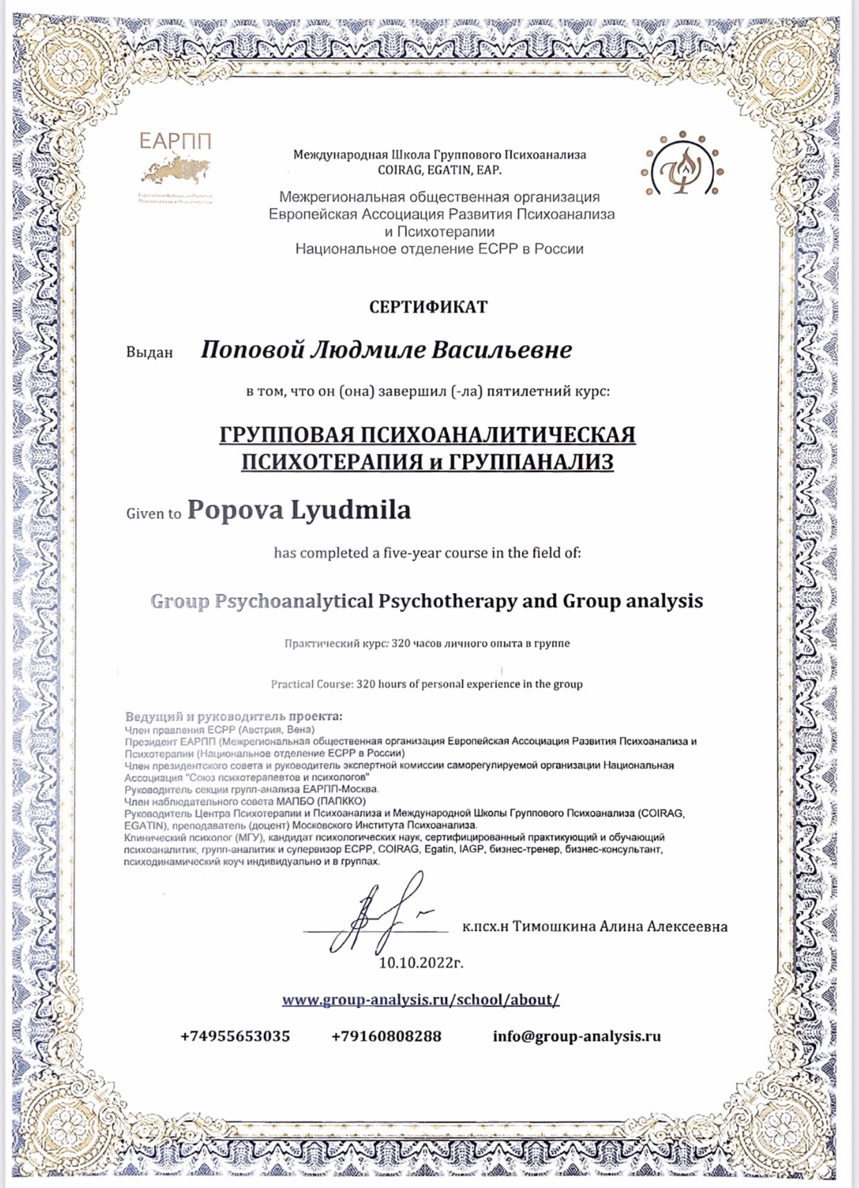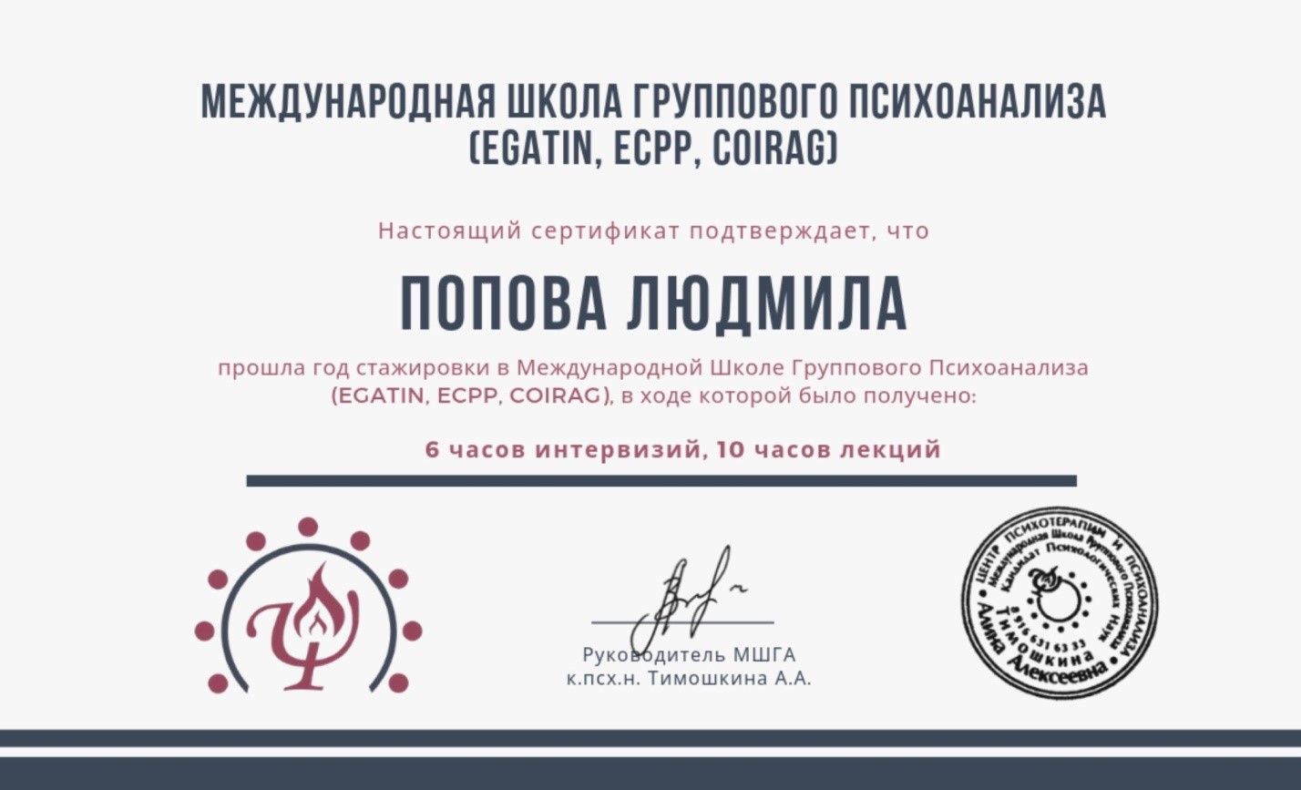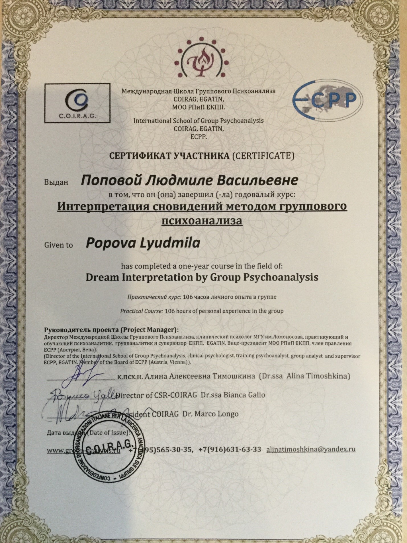 Личный анализ у сертифицированного психоаналитика ECPP, COIRAG, Egatin, IAGP. (с 2014г) - 900 часов.
