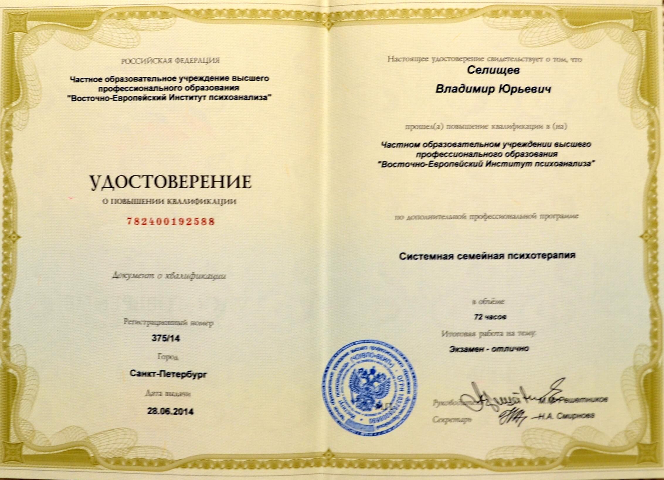 - Повышение квалификации - Восточно - Европейский институт психоанализа (г. Санкт-Петербург). «Системная семейная психотерапия».