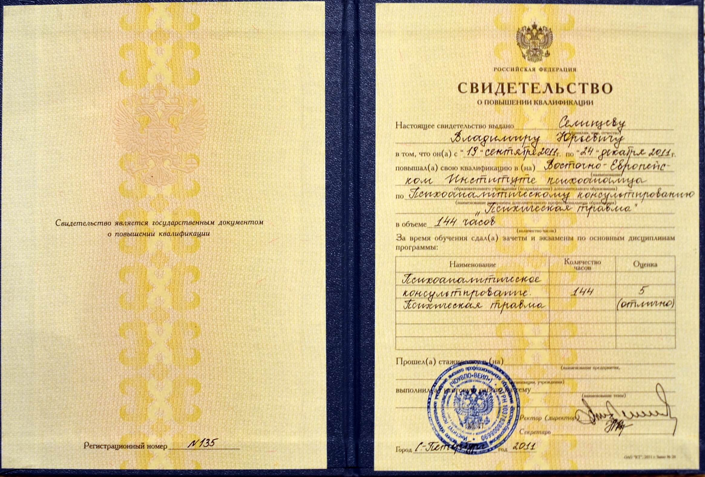 - Повышение квалификации - Восточно - Европейский институт психоанализа (г. Санкт-Петербург). «Психоаналитическое консультирование. Психическая травма».