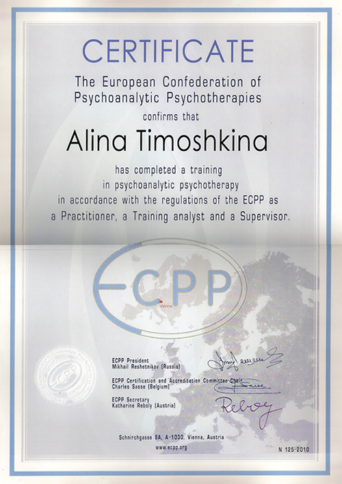 - сертифицированный практикующий и обучающий психоаналитик и супервизор ЕАРПП (Европейская Ассоциация Развития Психоанализа и Психотерапии Национальное отделение ECPP в России)