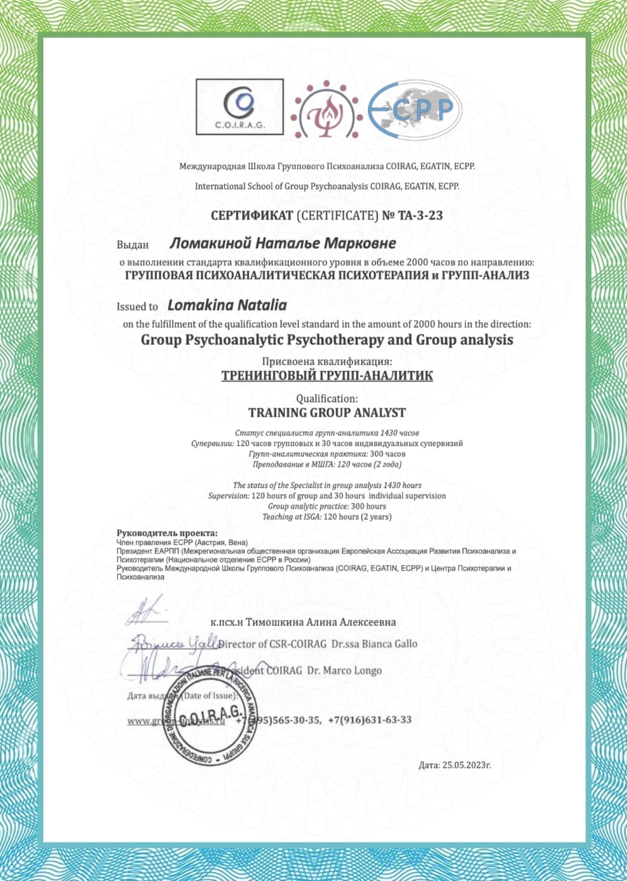 Московский институт психоанализа. Теория и практика группового и индивидуального психоанализа. Группаналитик.