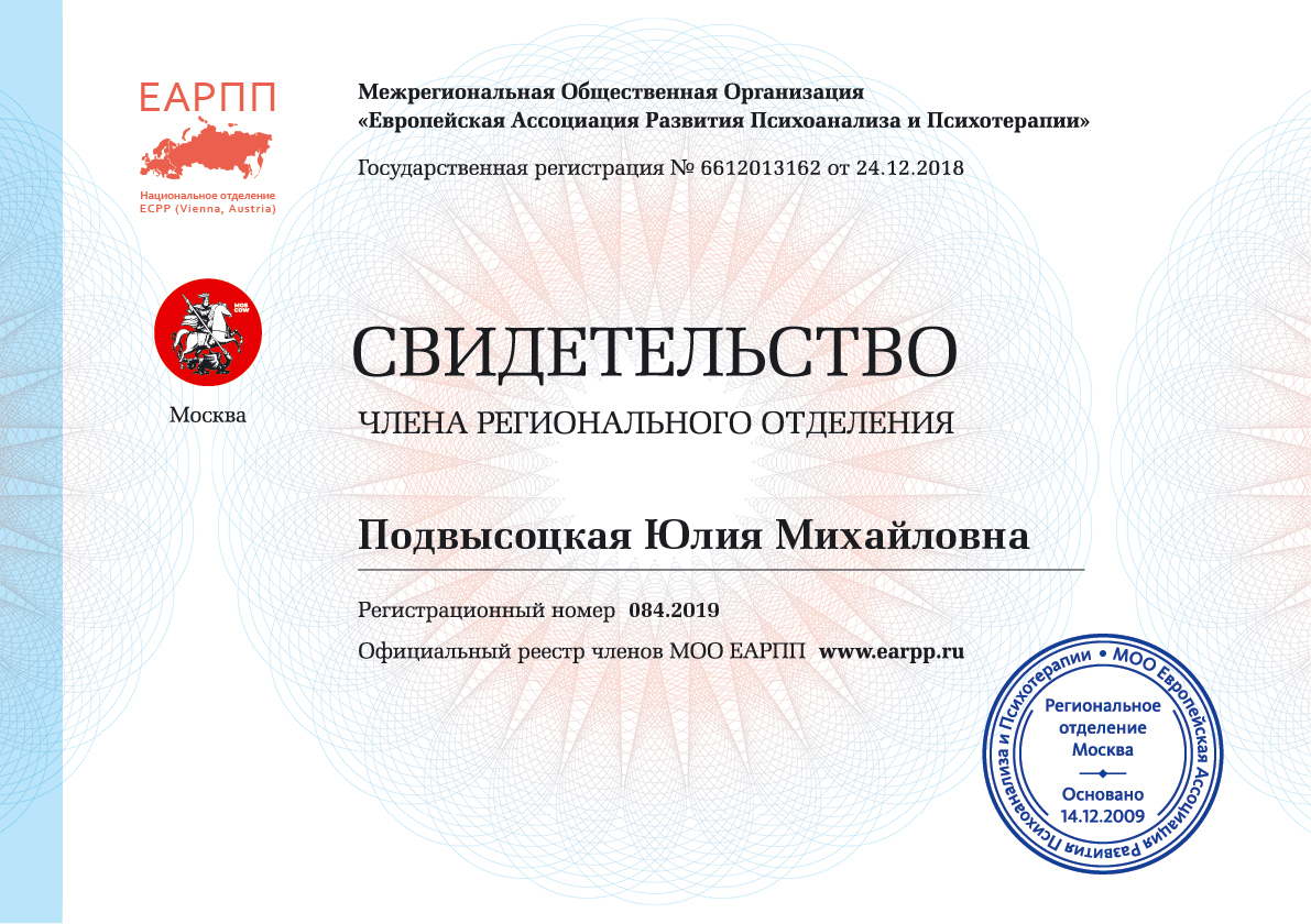 Член МОО «Европейская Ассоциация Развития Психоанализа и Психотерапии»;